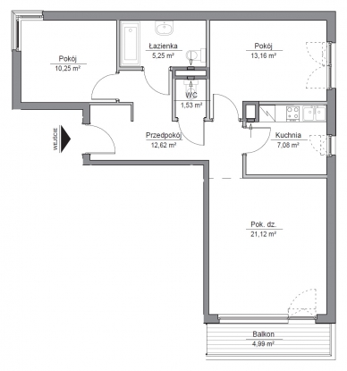 Duży balkon (4,99 m²) we wnęce, zapewnia ochronę przed warunkami atmosferycznymi.