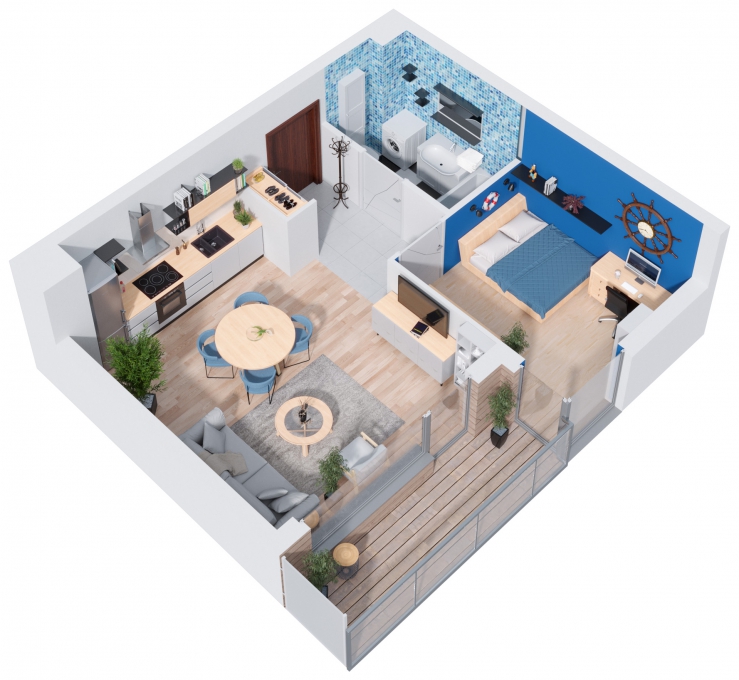 * wizualizacja przedstawia jedną z możliwości ustawienia mebli i wykończenia wnętrz